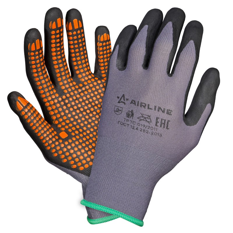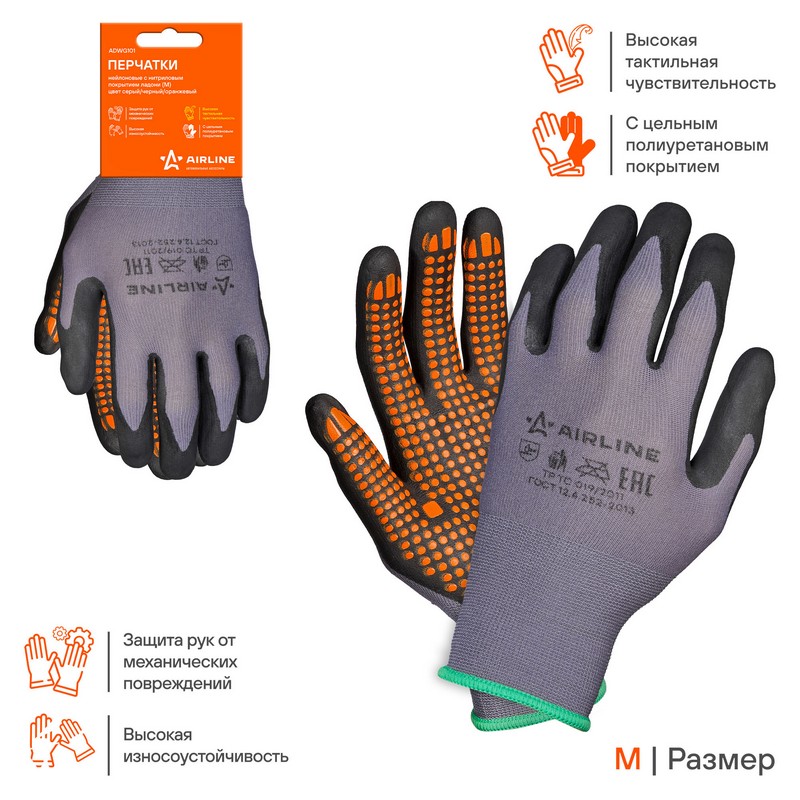 Перчатки нейлоновые с нитриловым покрытием ладони (М) сер./черн./оранж., с подвесом (ADWG101)